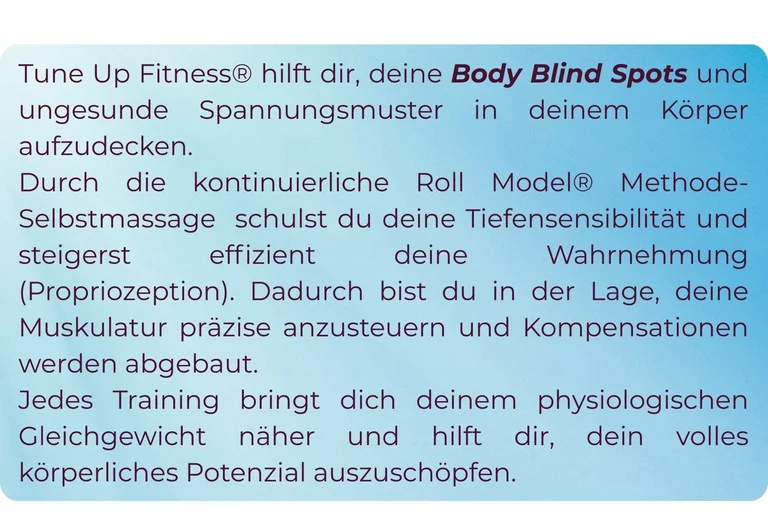 Tune Up Fitness® ist eine Fitness-Therapie, die Selbstmassage, spezielle hocheffiziente Korrekturübungen und Yoga verbindet. Diese einzigartige Kombination lindert und beseitigt muskulär bedingte Schmerzen, korrigiert Haltungsprobleme und steigert die körperliche und mentale Leistungsfähigkeit.